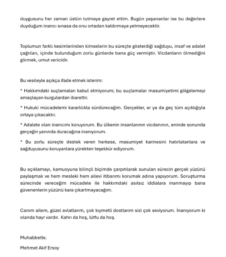 İstanbul Cumhuriyet Başsavcılığı'nın yürüttüğü soruşturma kapsamında gözaltına alınan ve tutuklanan eski Haber Türk Genel Yayın Yönetmeni Mehmet Akif Ersoy, avukatları aracılığıyla bir açıklama yaptı. Ersoy, açıklamasında suçlamaları ve iddiaları reddetti.