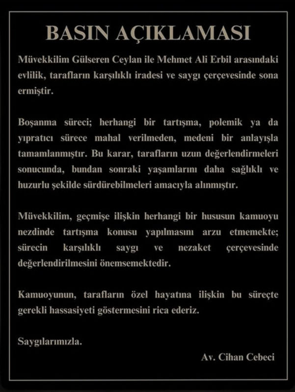 Gülseren Ceylan'ın avukatı Cihan Cebeci, yaptığı açıklamada; "Müvekkilim Gülseren Ceylan ile Mehmet Ali Erbil arasındaki evlilik, tarafların karşılıklı iradesi ve saygı çerçevesinde sona ermiştir.