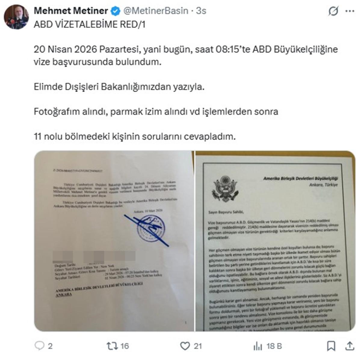 "DIŞİŞLERİ BAKANLIĞIMIZDAN YAZIYLA VİZE BAŞVURUSUNDA BULUNDUM""20 Nisan 2026 Pazartesi, yani bugün, saat 08:15’te ABD Büyükelçiliğine vize başvurusunda bulundum. Elimde Dışişleri Bakanlığımızdan yazıyla. Fotoğrafım alındı, parmak izim alındı ve işlemlerden sonra 11 nolu bölmedeki kişinin sorularını cevapladım.