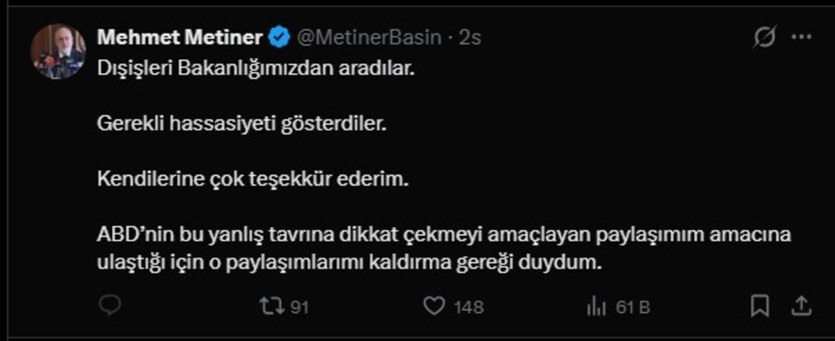 Metiner olayın gündem olmasından sonra paylaşımını sildi ve ikinci bir paylaşım yaptı. Metiner o paylaşımında ise, "Dışişleri Bakanlığımızdan aradılar. Gerekli hassasiyeti gösterdiler. Kendilerine çok teşekkür ederim. ABD’nin bu yanlış tavrına dikkat çekmeyi amaçlayan paylaşımım amacına ulaştığı için o paylaşımlarımı kaldırma gereği duydum" dedi.