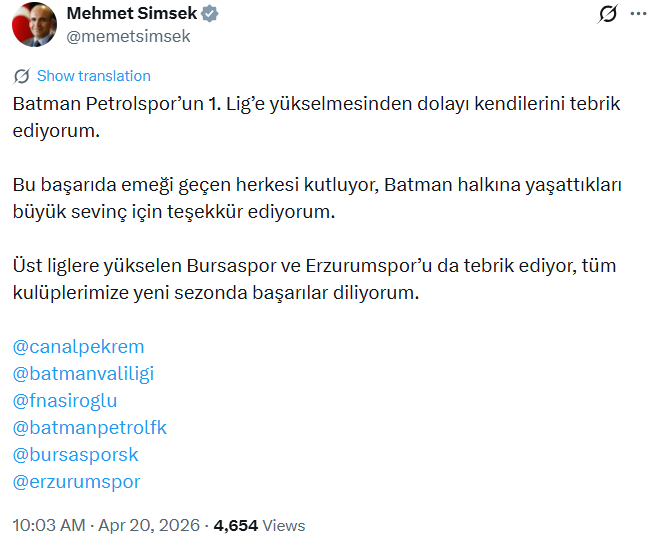 Hazine ve Maliye Bakanı Mehmet Şimşek, Batman Petrolspor'un 1. Lig'e yükselmesinden dolayı tebrik paylaşımında bulundu.