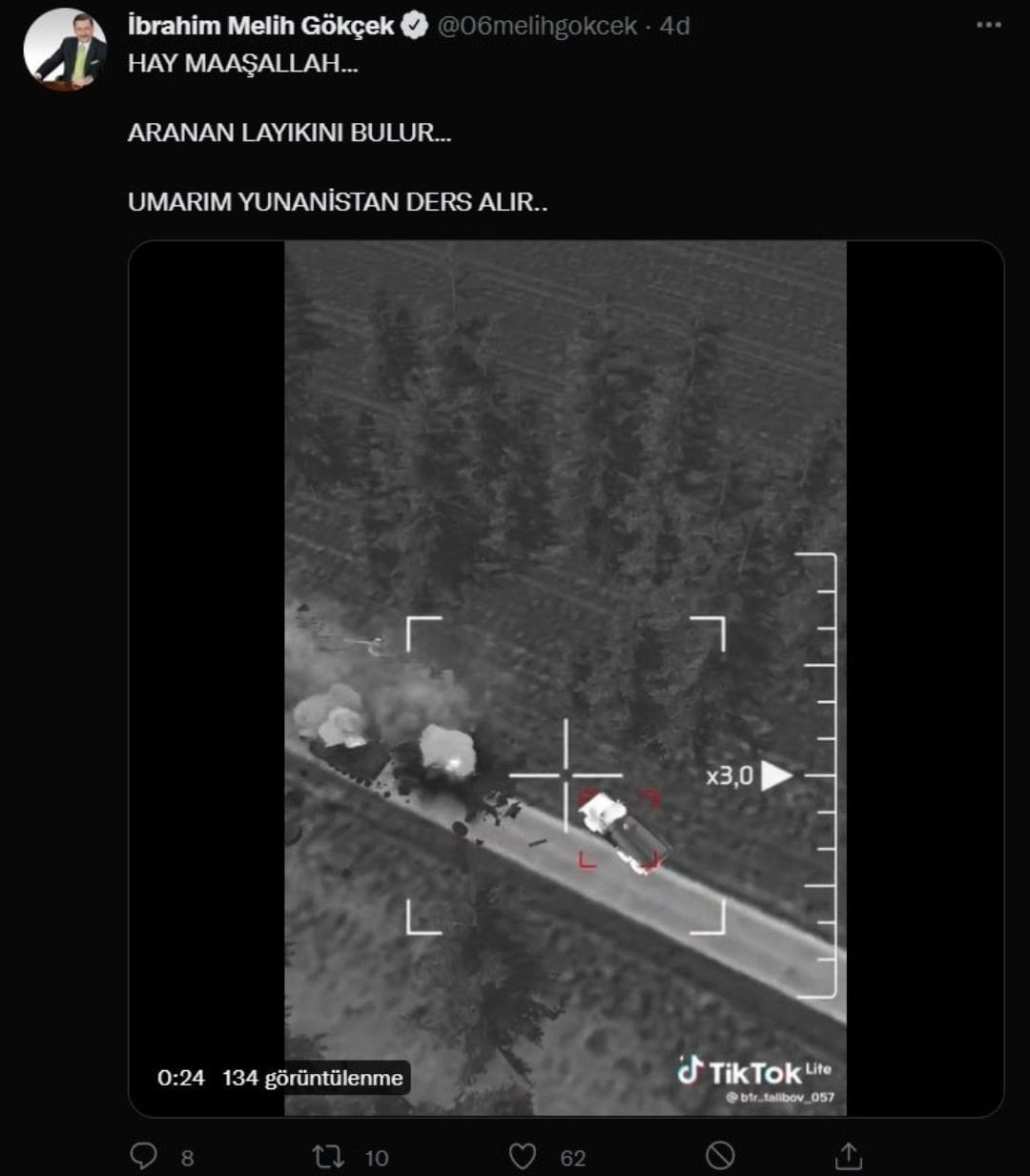 Gökçek, video oyunda yer alan bir kesiti "Hayy Maşaallah... Aranan layıkını bulur... Umarım Yunanistan ders alır" notuyla paylaşmıştı.