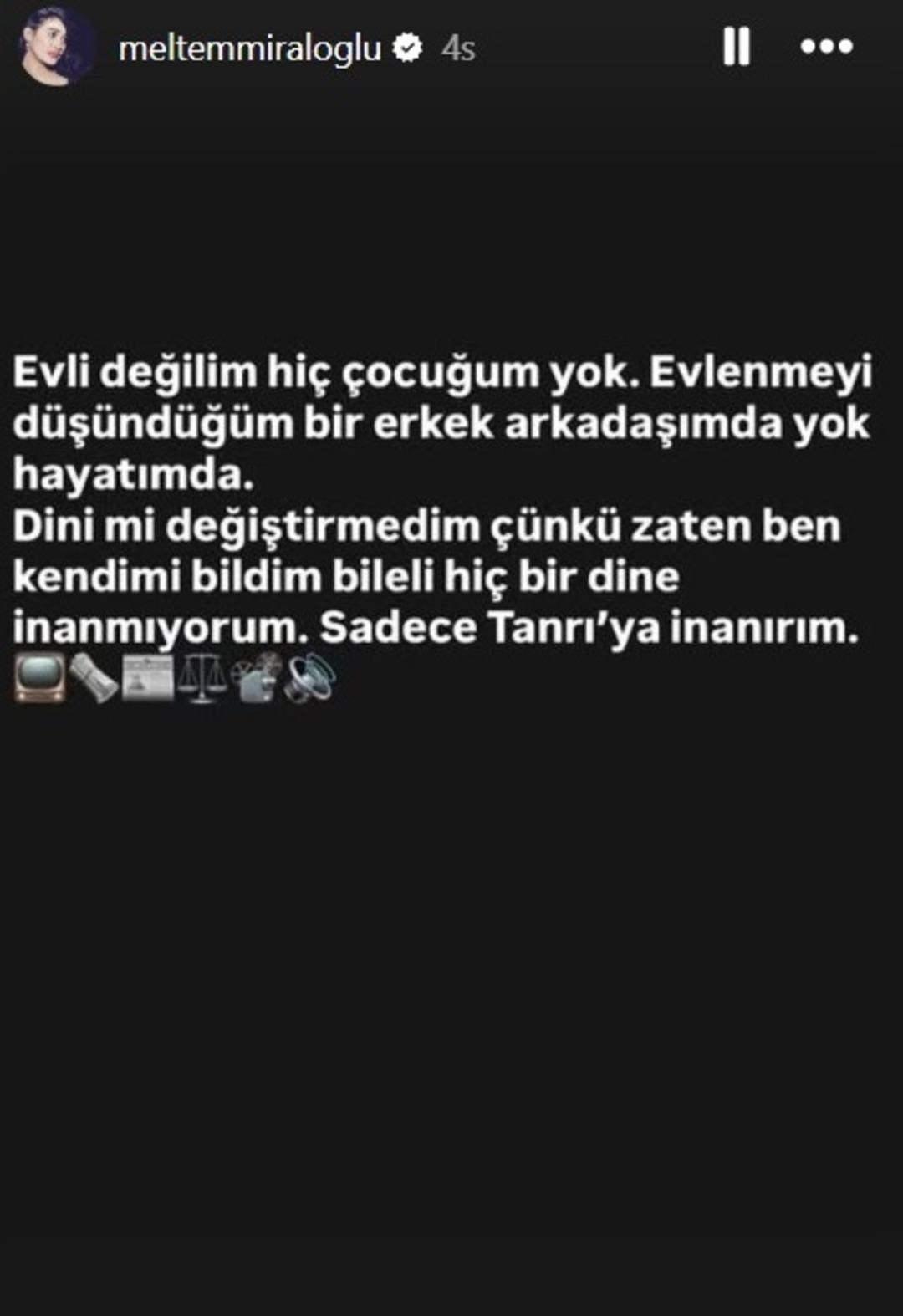 Konuyla ilgili sosyal medya hesabından açıklama yapan oyuncu, paylaşımında; "Evli değilim, hiç çocuğum yok. Evlenmeyi düşündüğüm bir erkek arkadaşım da yok. Dinimi değiştirmedim.” ifadelerini kullandı.