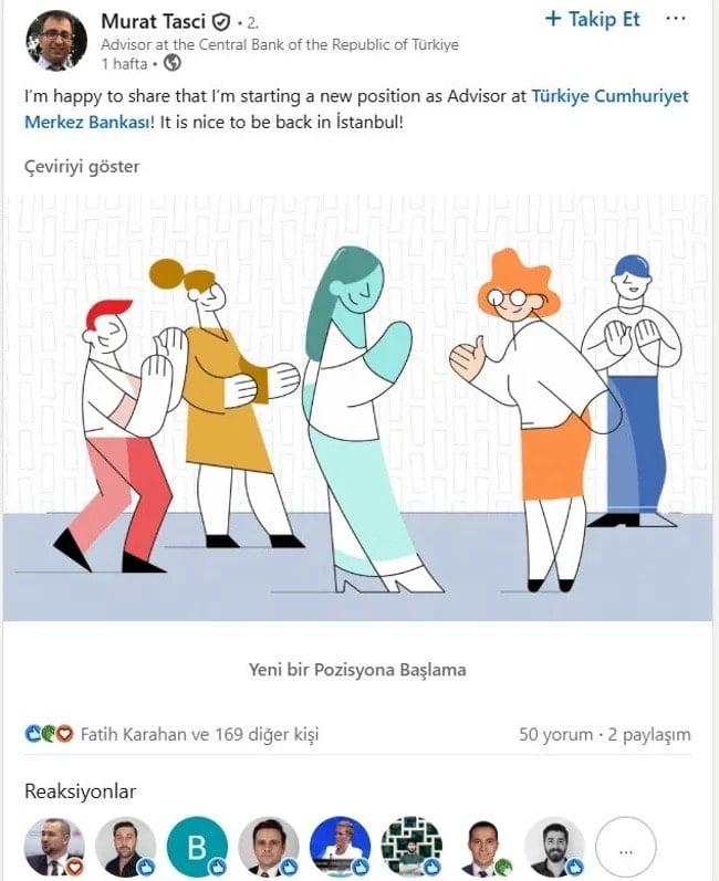 TCMB'nin yeni danışmanı Murat Taşçı, göreve başladığını profesyonel iş ağı LinkedIn üzerinden duyurdu.