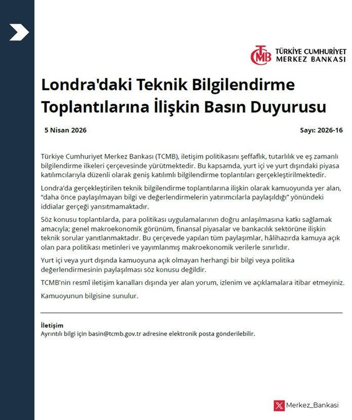 Merkez Bankası (TCMB), Londra’da düzenlenen teknik bilgilendirme toplantılarına ilişkin kamuoyunda yer alan iddialara yönelik bir basın açıklaması yayımladı.