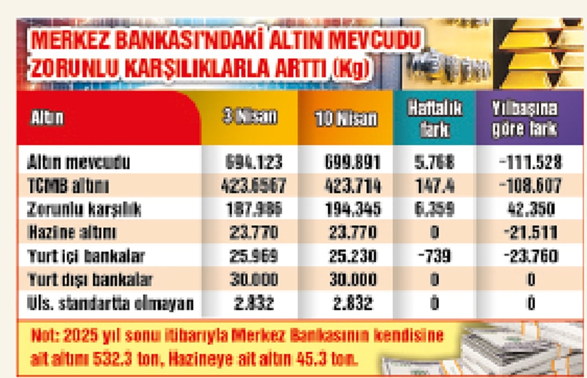 Merkez Bankası geçen hafta 147 ton altın alarak satıştan alıma geçti. Yurt içi bankaların altın mevcudu ise bir haftada 738 kilogram azaldı. Merkez Bankası’nın kendisine ait olan altın varlığı yılbaşından bu yana 108.6 ton azaldı. Savaşla birlikte altın satışına geçen Merkez Bankası’nın elinde 10 Nisan itibarıyla 423.7 ton altını bulunuyor.