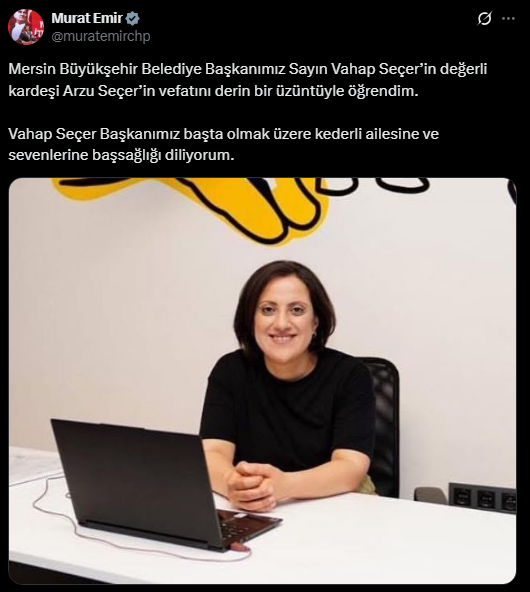 "Mersin Büyükşehir Belediye Başkanımız Sayın Vahap Seçer’in değerli kardeşi Arzu Seçer’in vefatını derin bir üzüntüyle öğrendim. Vahap Seçer Başkanımız başta olmak üzere kederli ailesine ve sevenlerine başsağlığı diliyorum."