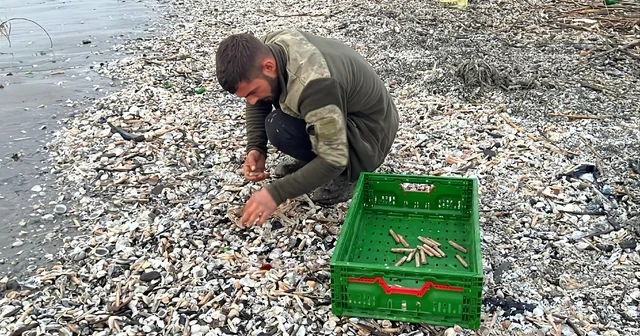 Mersin'de sel ve fırtına sonrası oluşan güçlü dalgalarla birlikte Adanalıoğlu sahilinde binlerce kargı midyesi kıyıya vururken, balıkçılar midyeleri yem yapmak için topladı.