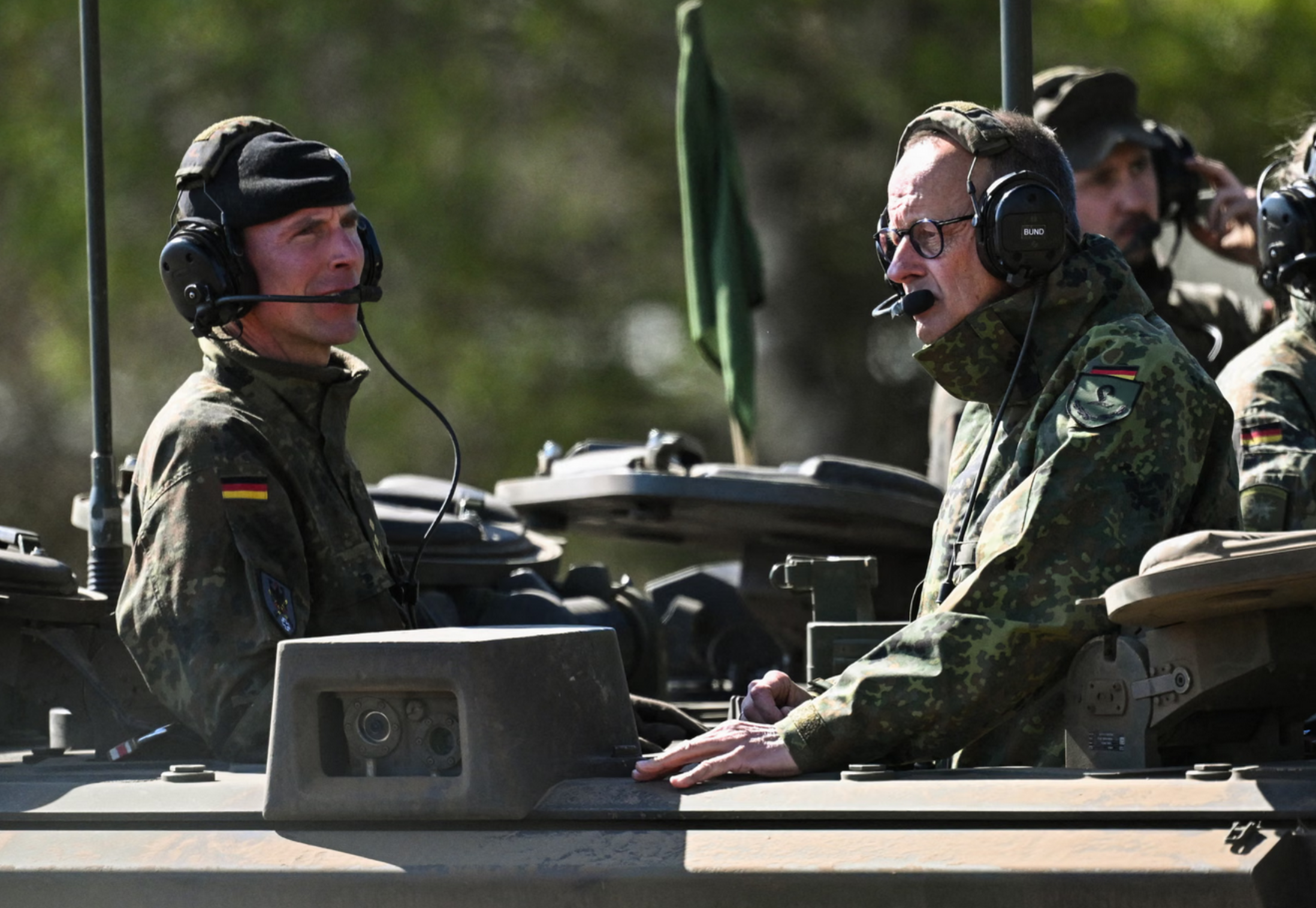 Üstüne kamuflajları çeken Merz, Munster'deki askeri üsteki ziyaretinde bizzat tanka bindi ve kafasında tank komutanı kulaklığını takarak askeri güçleri yönetti.