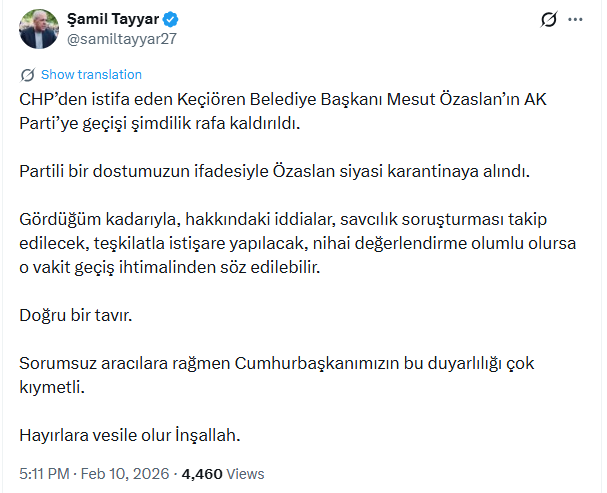 SİYASİ KARANTİNAYI ŞAMİL TAYYAR DUYURDU!AKP’li Şamil Tayyar, sosyal medya hesabından yaptığı açıklamada Özarslan’ın siyasi karantinaya alındığını ve AKP’ye geçişinin rafa kaldığını duyurdu. Tayyar, açıklamasında “CHP’den istifa eden Keçiören Belediye Başkanı Mesut Özaslan’ın AK Parti’ye geçişi şimdilik rafa kaldırıldı. Partili bir dostumuzun ifadesiyle Özaslan siyasi karantinaya alındı.” ifadelerini kullandı.