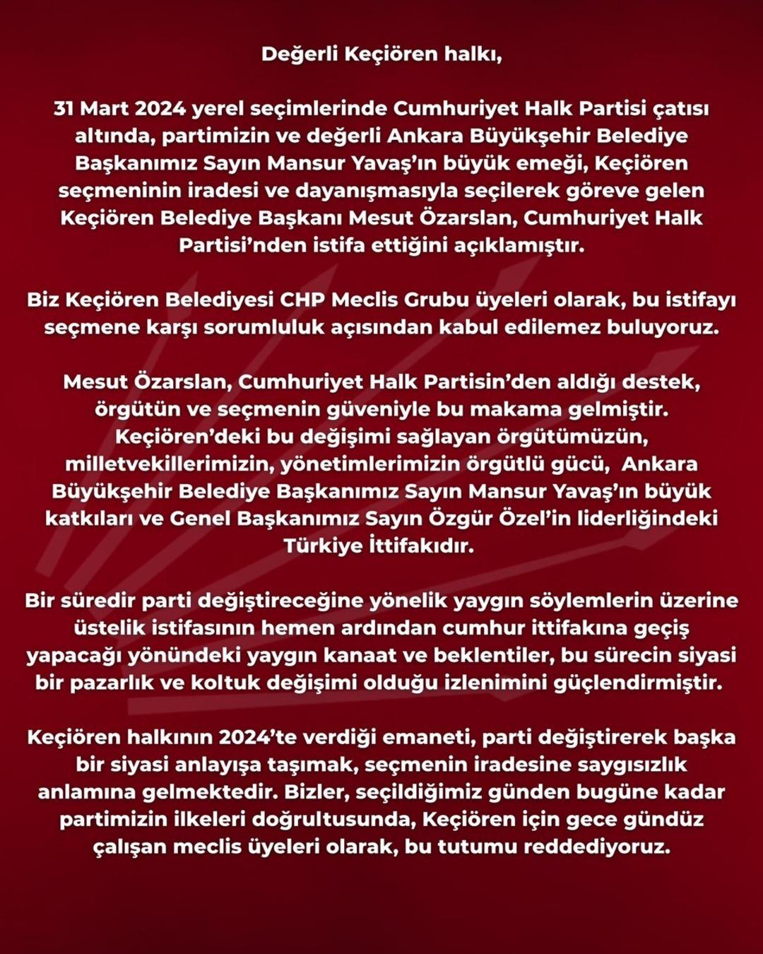 Keçiören Belediye Meclisi'nin CHP'li 20 üyesi ortak açıklama yayınlayarak, partilerinde kalacaklarını duyurdu. Açıklamada, "Keçiören halkının 2024'de verdiği emaneti, parti değiştirerek başka bir siyasi anlayışa taşımak, seçmenin iradesine saygısızlık anlamına gelmektedir." ifadeleri yer aldı.