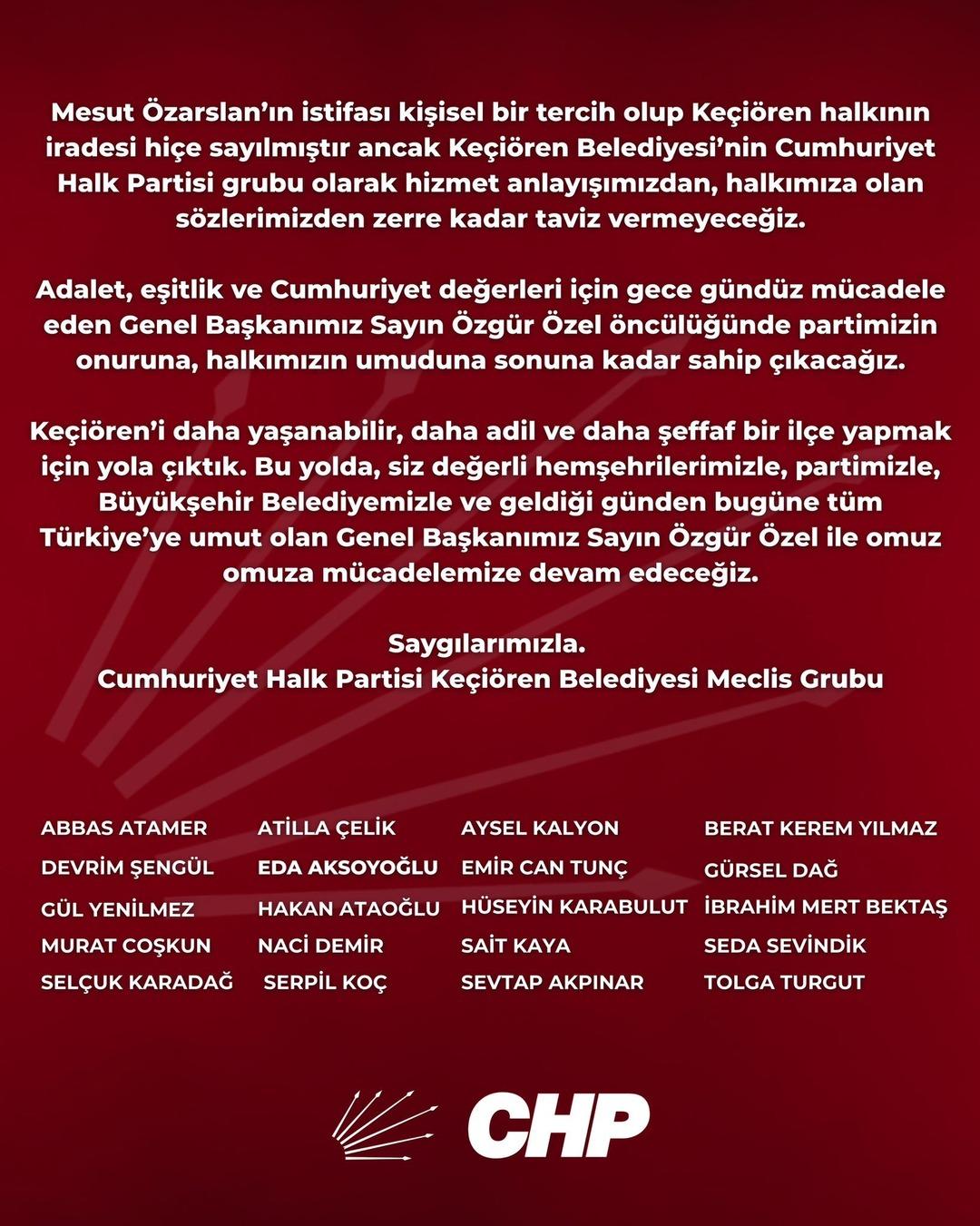 Keçiören Belediye Başkanı Mesut Özarslan'ın CHP'den istifası gündemi hareketlendirdi. Özarslan'ın istifasının ardından gözler CHP'li meclis üyelerine çevrilmişti.