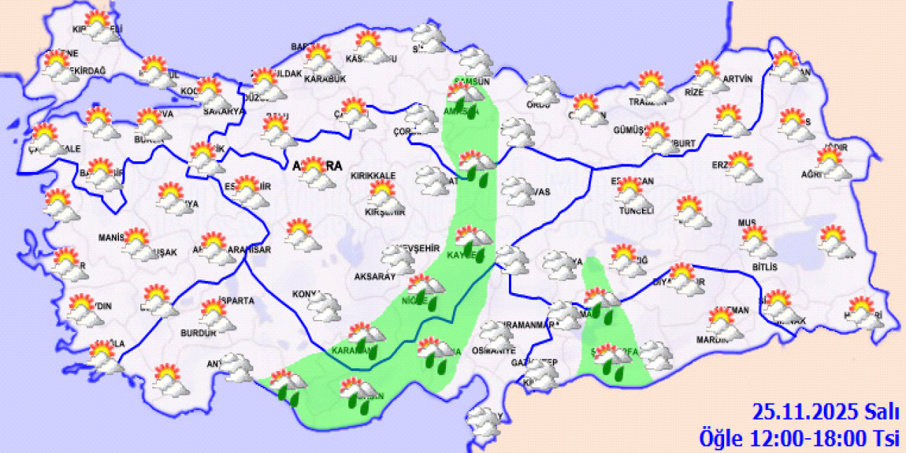 İÇ ANADOLUParçalı ve çok bulutlu, Karaman, Aksaray, Niğde, Nevşehir, Kayseri ve Sivas çevrelerinin aralıklı sağanak yağışlı geçeceği tahmin ediliyor. Sabah ve gece saatlerinde bölge genelinde pus ve yer yer sis bekleniyor.