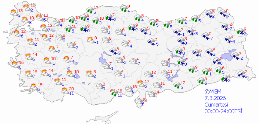 Meteoroloji verilerine göre 7 Mart Cumartesi tarihinde kar yağması beklenen il sayısı 21 oldu. 7 Mart Cuma günü kar ya da karla karışık yağmur yağması beklenen iller şu şekilde: