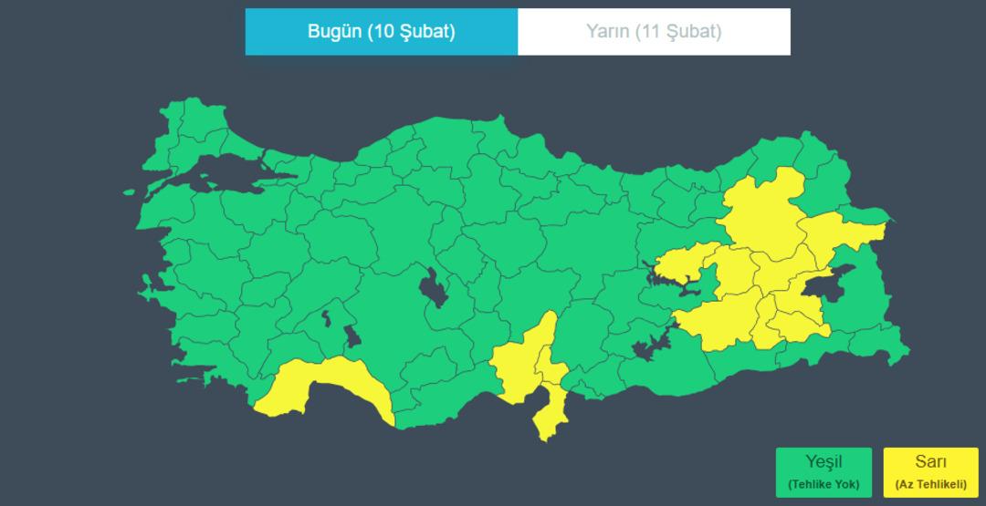 Meteoroloji'nin uyarıda bulunduğu 13 il arasında Adana, Ağrı, Antalya, Bingöl, Bitlis, Diyarbakır, Erzurum, Hatay, Muş, Siirt, Tunceli, Batman ve Osmaniye yer aldı.