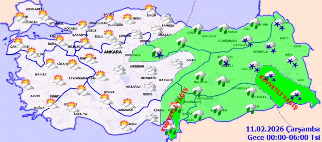 Yağışların, Antalya’nın doğusu, Hatay, Osmaniye, Erzurum, Ağrı, Bitlis, Tunceli, Bingöl, Muş, Hakkari, Şırnak, Batman, Siirt çevreleri, Adana'nın doğusu ve Kahramanmaraş'ın batısında yerel kuvvetli olması bekleniyor.