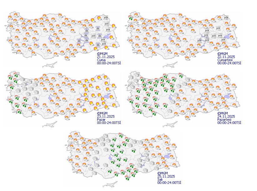 BUGÜN (21 KASIM) YURT GENELİNDE HAVA DURUMUÖte yandan Meteoroloji'nin 21 Kasım hava durumu tahminine göre, bugün ülkemizin kuzey, iç ve batı kesimleri parçalı yer yer çok bulutlu, gece saatlerinde Güney Ege kıyıları ile Balıkesir'in batı ilçerinin yerel sağanak yağışlı, diğer yerlerin az bulutlu ve açık geçeceği tahmin ediliyor. Rüzgarın; Marmara’nın batısı ile Kuzey Ege kıyılarında güney ve güneybatı yönlerden kuvvetli (40-60 km/saat), Trakya’da yer yer kısa süreli fırtına (50-70 km/ saat) şeklinde esmesi bekleniyor. Sabah ve gece saatlerinde Doğu Anadolu ile Güneydoğu Anadolu’nun kuzeyinde pus ve yer yer sis bekleniyor.