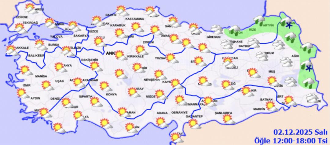 Meteoroloji Genel Müdürlüğü tarafından yapılan tahminlere göre: Ülkemiz geneli parçalı yer yer çok bulutlu, Doğu Anadolu’nun kuzeydoğusu ile Rize, Artvin, Muş, Bitlis ve Van çevrelerinin yağışlı geçeceği tahmin ediliyor. Yağışların, kıyı kesimlerde yağmur ve sağanak, iç kesimlerde yağmur ve karla karışık yağmur yüksek kesimlerde kar yağışı şeklinde görüleceği tahmin ediliyor. Sabah ve gece saatlerinde Marmara, Ege, İç Anadolu, Karadeniz’in iç kesimleri, Doğu Anadolu ile Güneydoğu Anadolu’nun kuzeyinde pus ve yer yer sis bekleniyor.