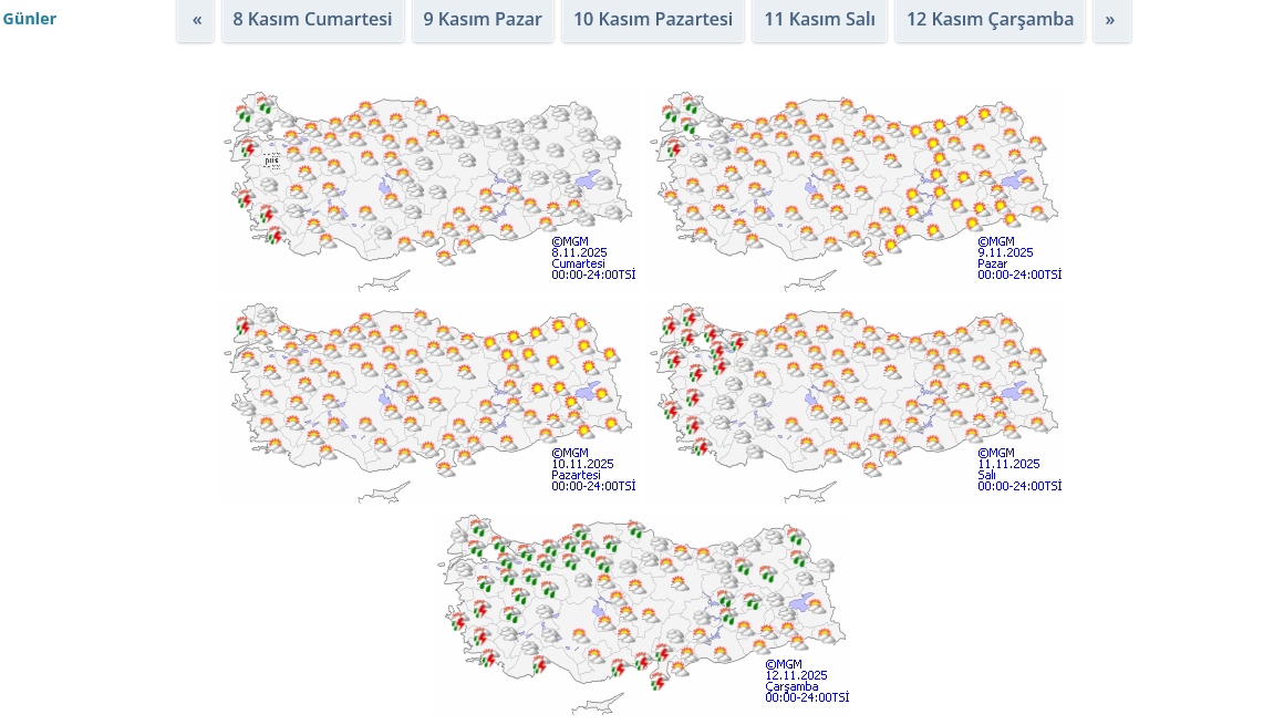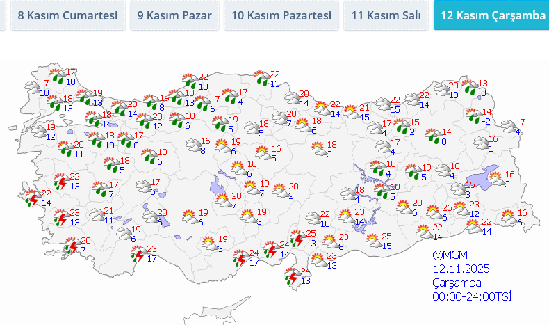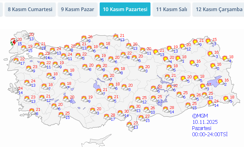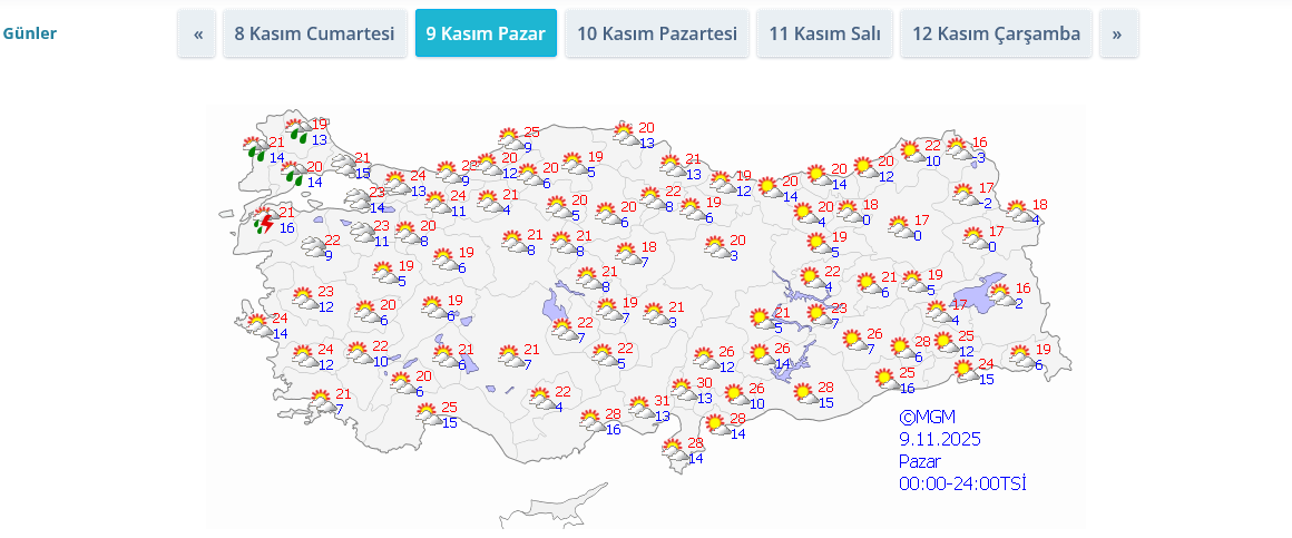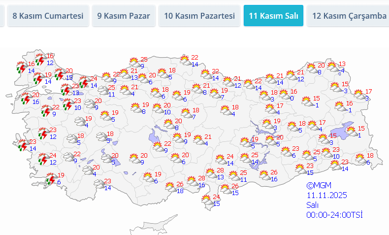 Meteoroloji Genel Müdürlüğü’nün (MGM) 8 Kasım tahminine göre, Türkiye genelinde hava parçalı ve yer yer çok bulutlu olacak. Kıyı Ege ile Trakya'da (Edirne, Kırklareli, Çanakkale), ayrıca Erzurum, Muş, Bitlis'in doğu ilçeleriyle Kars, Ağrı ve Van’ın batı kesimlerinde yerel sağanak ve gök gürültülü sağanak bekleniyor.