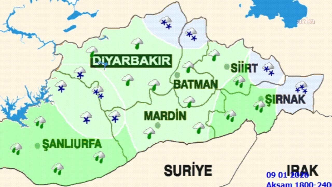 Meteoroloji Genel Müdürlüğü’nden yapılan değerlendirmede, “Diyarbakır ve Batman’ın kuzeyi, Siirt ve Şırnak’ın doğusu kuvvetli kar yağışlı geçeceği tahmin ediliyor” denildi. Açıklamada, Batman’ın kuzeyi, Şırnak’ın doğusu, Diyarbakır’ın kuzeydoğusu ve Siirt’in doğusunda kar yağışının 10-20 santimetreye ulaşması, yüksek kesimlerde ise 20 santimetrenin üzerine çıkmasının beklendiği belirtildi. Kuvvetli kar yağışının, cumartesi günü sabah saatlerine kadar etkili olacağı kaydedildi.
