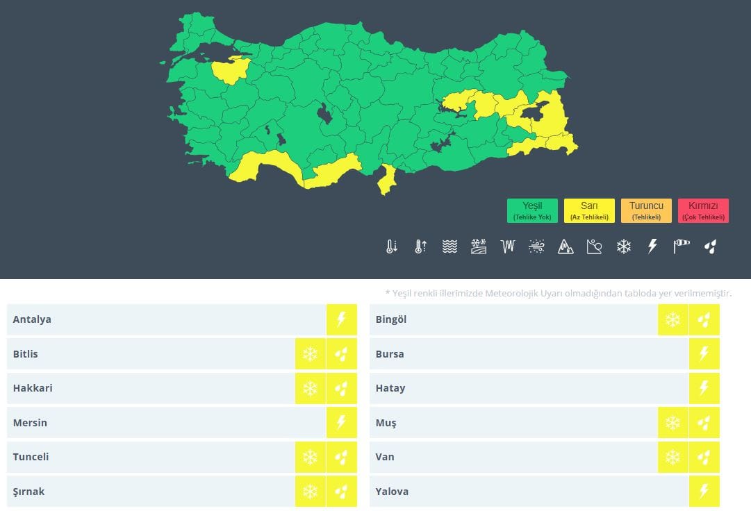 12 İLDE SARI KODLU ALARM VERDİKUVVETLİ YAĞIŞ UYARISI: Yağışların, Antalya’nın doğusu, Mersin'in batısı, Hatay, Kocaeli, Sakarya, Bursa, Bilecik, Bolu, Düzce, Tunceli, Bingöl, Muş, Bitlis, Şırnak, Hakkari ve Siirt çevrelerinde yerel kuvvetli olması beklendiğinden (ani sel, su baskını, yıldırım, yerel dolu yağışı, kıyılarda hortum, kuvvetli rüzgar ve fırtına ile ulaşımda aksamalar gibi) olumsuzluklara karşı dikkatli ve tedbirli olunması gerekmektedir.