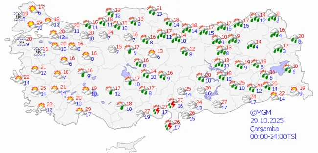 29 Ekim Çarşamba gününe ilişkin haritalı hava durumu raporu