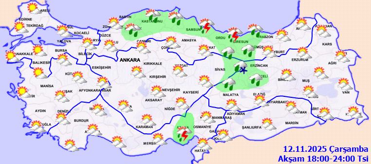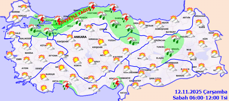 KARADENİZHava Durumu: Parçalı ve çok bulutlu, sağanak ve gök gürültülü sağanak yağışlı, Rüzgar: Batı Karadeniz'de batı ve kuzeybatıdan 4 ila 6, doğusu yer yer 7, öğle saatlerinden sonra 3 ila 5, doğusu yer yer 6; Doğu Karadeniz'de batı ve kuzeybatıdan, doğusu güneybatıdan 3 ila 5 kuvvetinde, Dalga: 1,0 ila 2,0 m, batısı yer yer 3,0 m, Görüş: İyi, yağış anında orta.