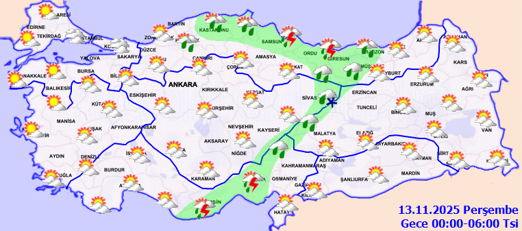 ORTA ve DOĞU KARADENİZParçalı ve çok bulutlu, Çorum dışında Orta Karadeniz ile Giresun, Trabzon ve Gümüşhane çevrelerinin sağanak ve gök gürültülü sağanak yağışlı geçeceği tahmin ediliyor.