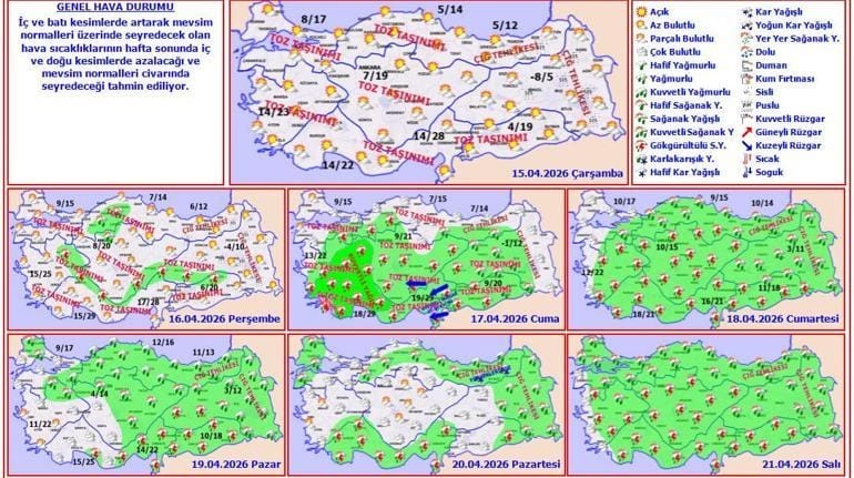 Meteoroloji Genel Müdürlüğü'nün yayımladığı haftalık hava tahmin raporuna göre, yurt genelinde hafta ortasına kadar mevsim normalleri üzerinde seyredecek olan sıcak hava, hafta sonuna doğru yerini yağışlı günlere bırakacak.