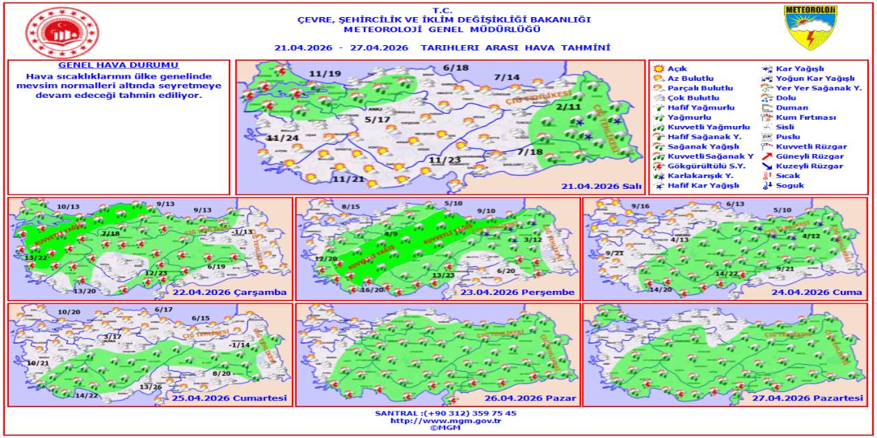 DALGA DALGA VURACAKHaftalık tahmin haritası (21-27 Nisan), yağışlı sistemin hafta boyunca yurdu terk etmeyeceğini dalga dalga vuracağını gösterdi. Haritadaki kritik uyarılarsa şu şekilde gerçekleşti:
