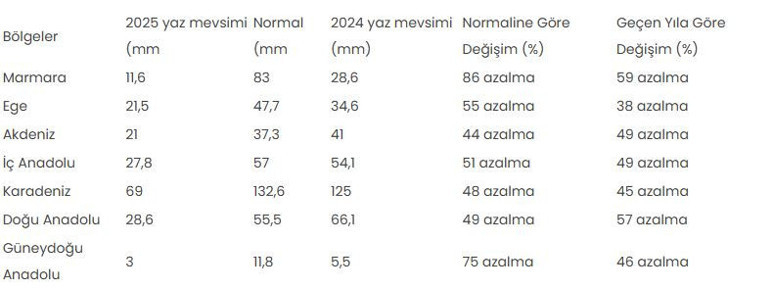 Bu yazda görülen yağışlar, tüm bölgelerin normallerinin ve geçen yılın altında gerçekleşirken Marmara ve Karadeniz’de 65, Akdeniz ve İç Anadolu’da 17, Ege Bölgesi’nde son 16 yılın en düşük yağışları tespit edildi.