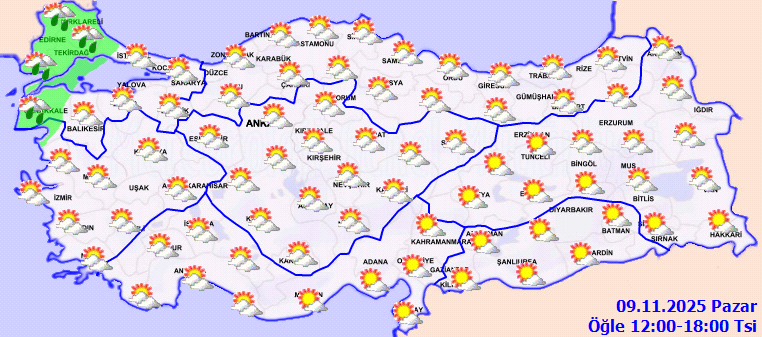 Meteoroloji Genel Müdürlüğü tarafından yapılan son tahminlere göre; yurdun kuzeybatı kesimleri parçalı yer yer çok bulutlu, Edirne, Kırklareli, Tekirdağ, Çanakkale çevreleri ile Balıkesir'in batı ilçelerinin aralıklı sağanak yağışlı, diğer yerlerin az bulutlu ve açık geçeceği tahmin ediliyor.