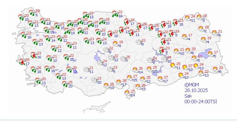 İstanbul'da bugün ve yarın gök gürültülü kuvvetli sağanak var, çarşamba az bulutlu. Ankara ve İzmir'de ise bugün hava parçalı bulutlu olacak. Yarın her iki şehirde de gök gürültülü sağanak bekleniyor. En yüksek sıcaklık İzmir'de 26, İstanbul'da 25, Ankara'da 24 derece.