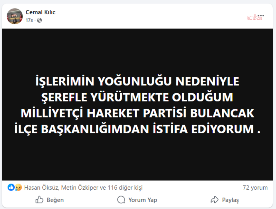 "İşlerimin yoğunluğu nedeniyle şerefle yürütmekte olduğum Milliyetçi Hareket Partisi Bulancak İlçe Başkanlığımdan istifa ediyorum ."
