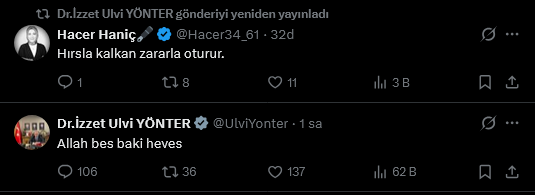 Yönter bunun ardından yazar Hacer Haniç’in “Hırsla kalkan zararla oturur” paylaşımını da yeniden paylaştı.