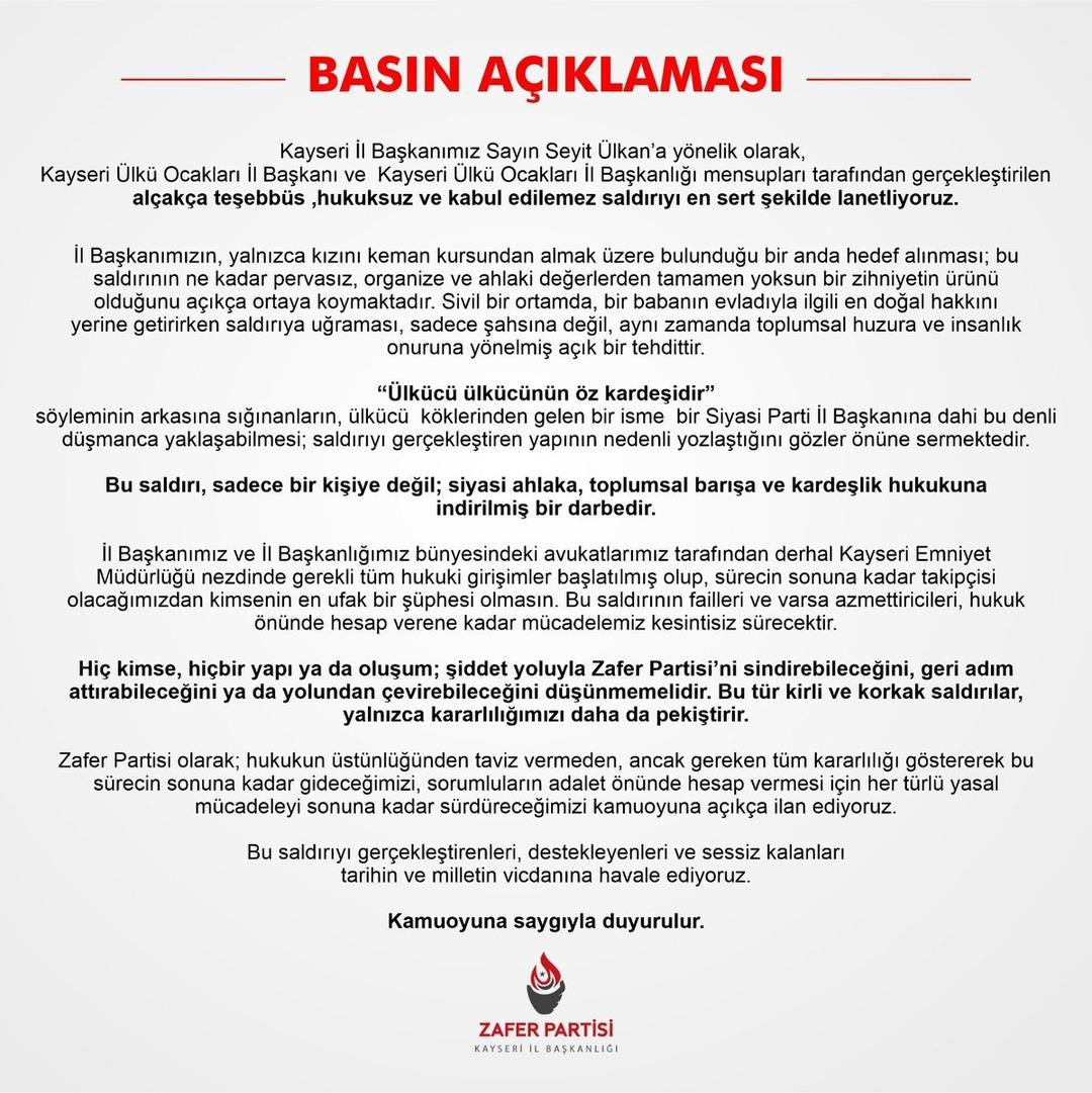 "Kayseri İl Başkanımız Sayın Seyit Ülkan'a yönelik olarak, Kayseri Ülkü Ocakları İl Başkanı ve Kayseri Ülkü Ocakları İl Başkanlığı mensupları tarafından gerçekleştirilen alçakça teşebbüs, hukuksuz ve kabul edilemez saldırıyı en sert şekilde lanetliyoruz.