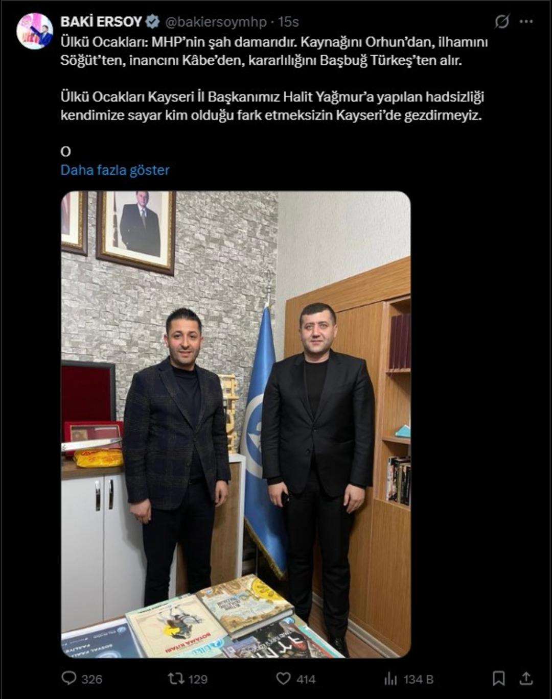"Ülkü Ocakları: MHP’nin şah damarıdır. Kaynağını Orhun’dan, ilhamını Söğüt’ten, inancını Kâbe’den, kararlılığını Başbuğ Türkeş’ten alır. Ülkü Ocakları Kayseri İl Başkanımız Halit Yağmur’a yapılan hadsizliği kendimize sayar kim olduğu fark etmeksizin Kayseri’de gezdirmeyiz. O korkudan Kayseri stadyumunda tuvalete saklanan genel başkan bozuntusuna da iletin ve unutmayın ki; Çakalların hükmü Bozkurt ayağa kalkana kadardır"