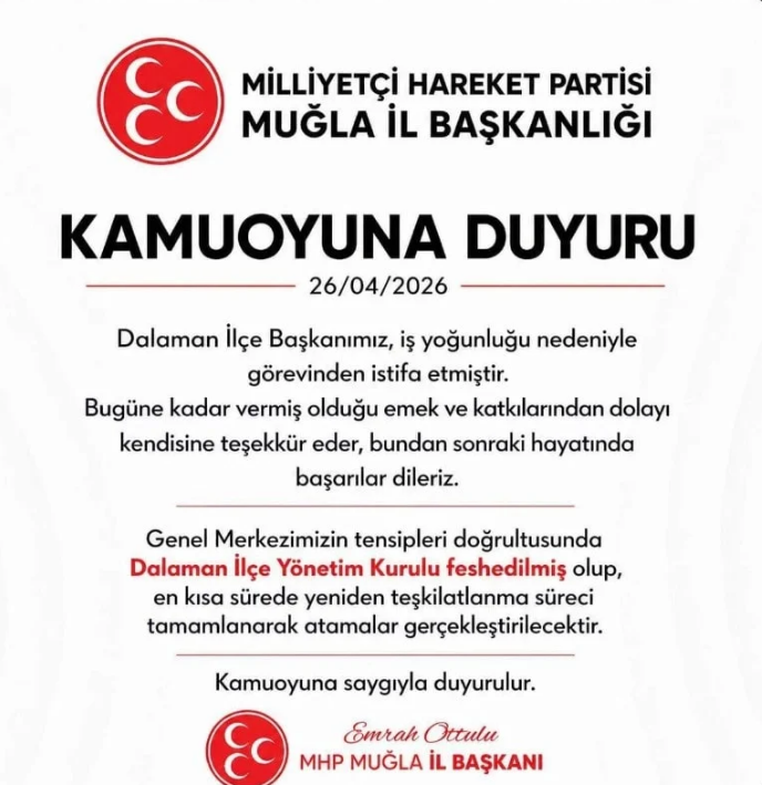 MHP Dalaman İlçe Başkanı Fatih Avcı, günler önce sosyal medya hesabından yaptığı açıklamada görevinden istifa ettiğini duyurmuştu.