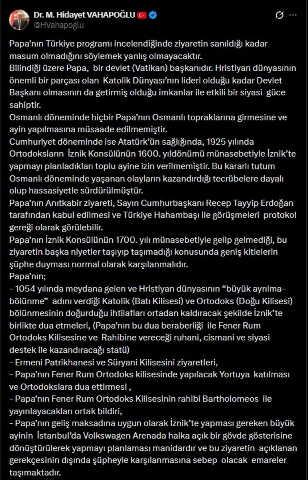 MHP'Lİ İSİMDEN PAPA'NIN ZİYARETİNE TEPKİOradan İstanbul'a hareket eden Papa bugün de helikopter ile İznik'e geçti. Papa'nın Türkiye ziyaretine MHP'nin 27. Dönem Milletvekili olan Hidayet Vahapoğlu tepki gösterdi.