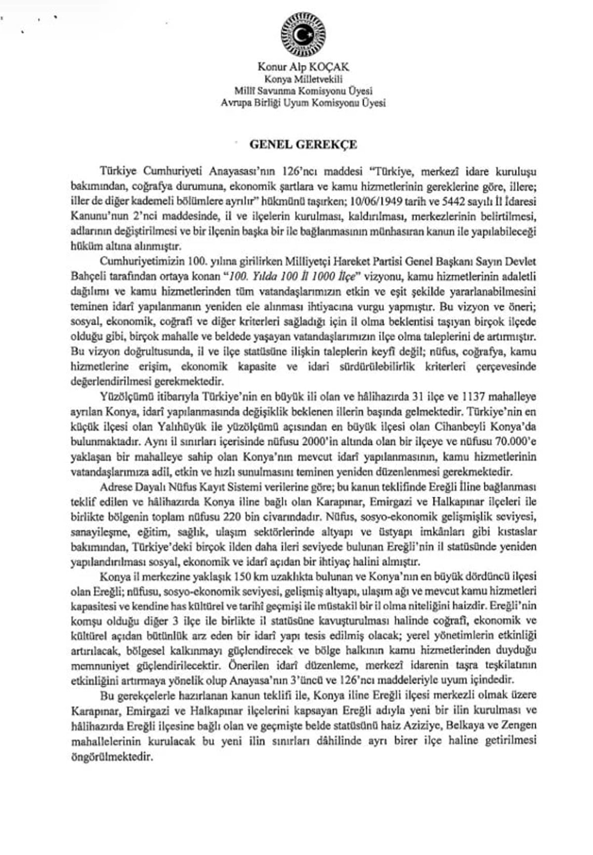 MECLİS'E SUNULDUTBMM’ye sunulan düzenlemeye göre halen Konya’ya bağlı olan Karapınar, Emirgazi ve Halkapınar ilçeleri yeni kurulacak Ereğli ili çatısı altında birleşecek. Ayrıca Ereğli’ye bağlı Aziziye, Belkaya ve Zengen mahallelerinin de yeni il bünyesinde ayrı birer ilçe olarak yapılandırılabileceği ifade edildi.
