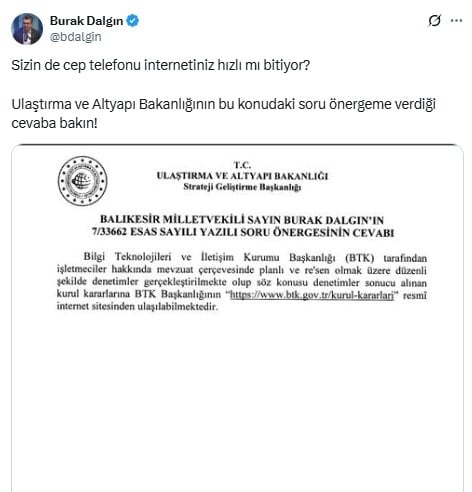 Milletvekili Dalgın, gelen yanıtı “Ulaştırma ve Altyapı Bakanlığının bu konudaki soru önergeme verdiği cevaba bakın!” mesajıyla paylaştı: