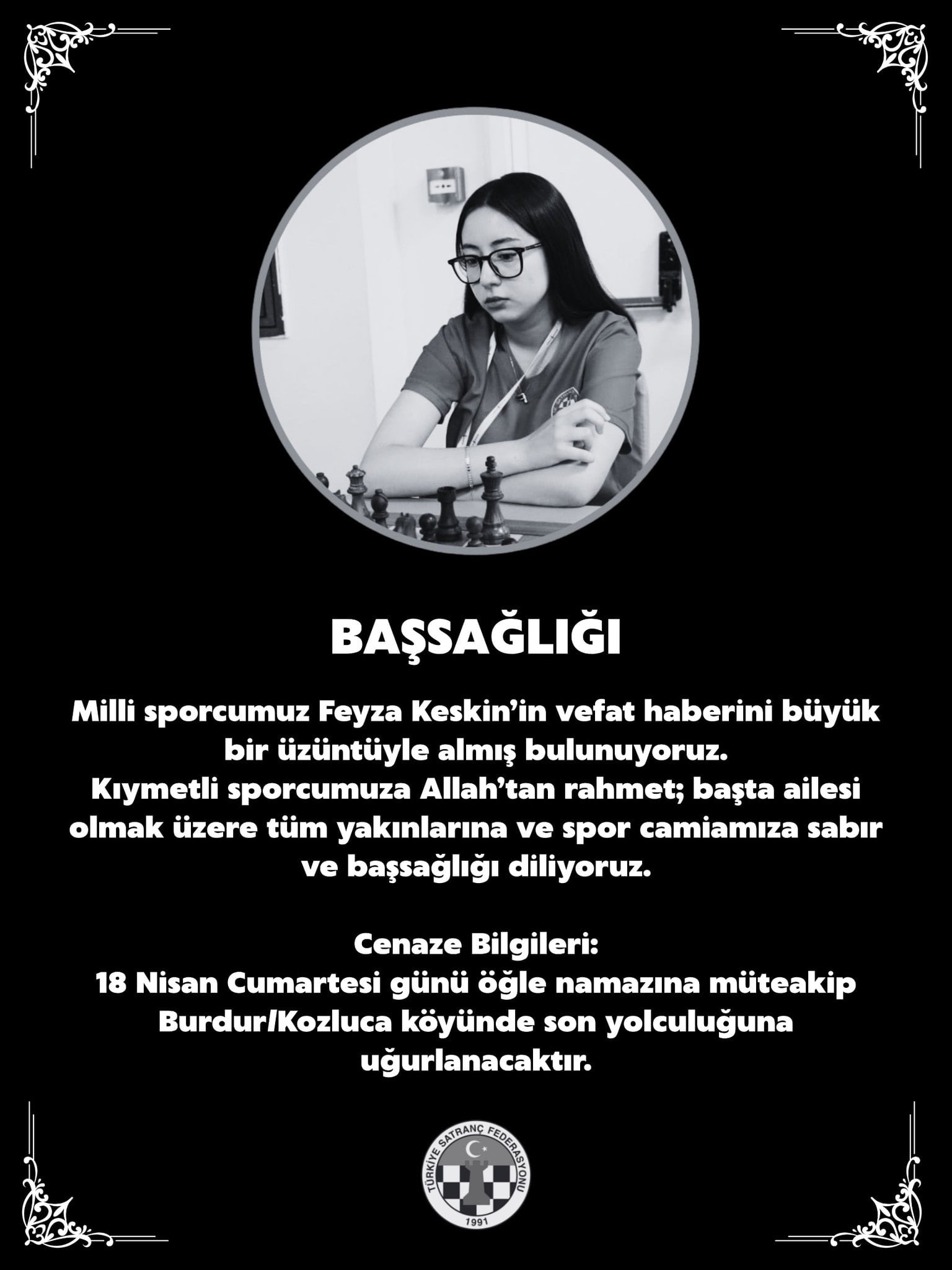 Milli satranç oyuncusu Feyza Keskin'in vefatı spor camiasını yasa boğdu. Konuyla ilgili resmi duyuru Türkiye Satranç Federasyonu tarafından yapıldı.
