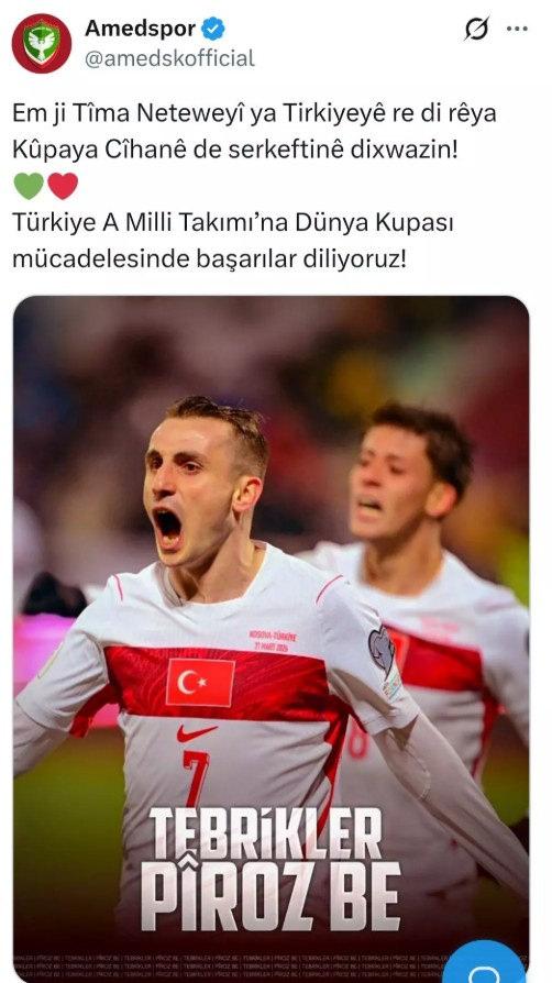 A Milli Takım'ın Kosova'yı 1-0 yenerek 24 yıl sonra Dünya Kupası'na gitmeye hak kazanmasının ardından Amedspor'un 'Milli Takım' paylaşımı eleştiri almıştı.