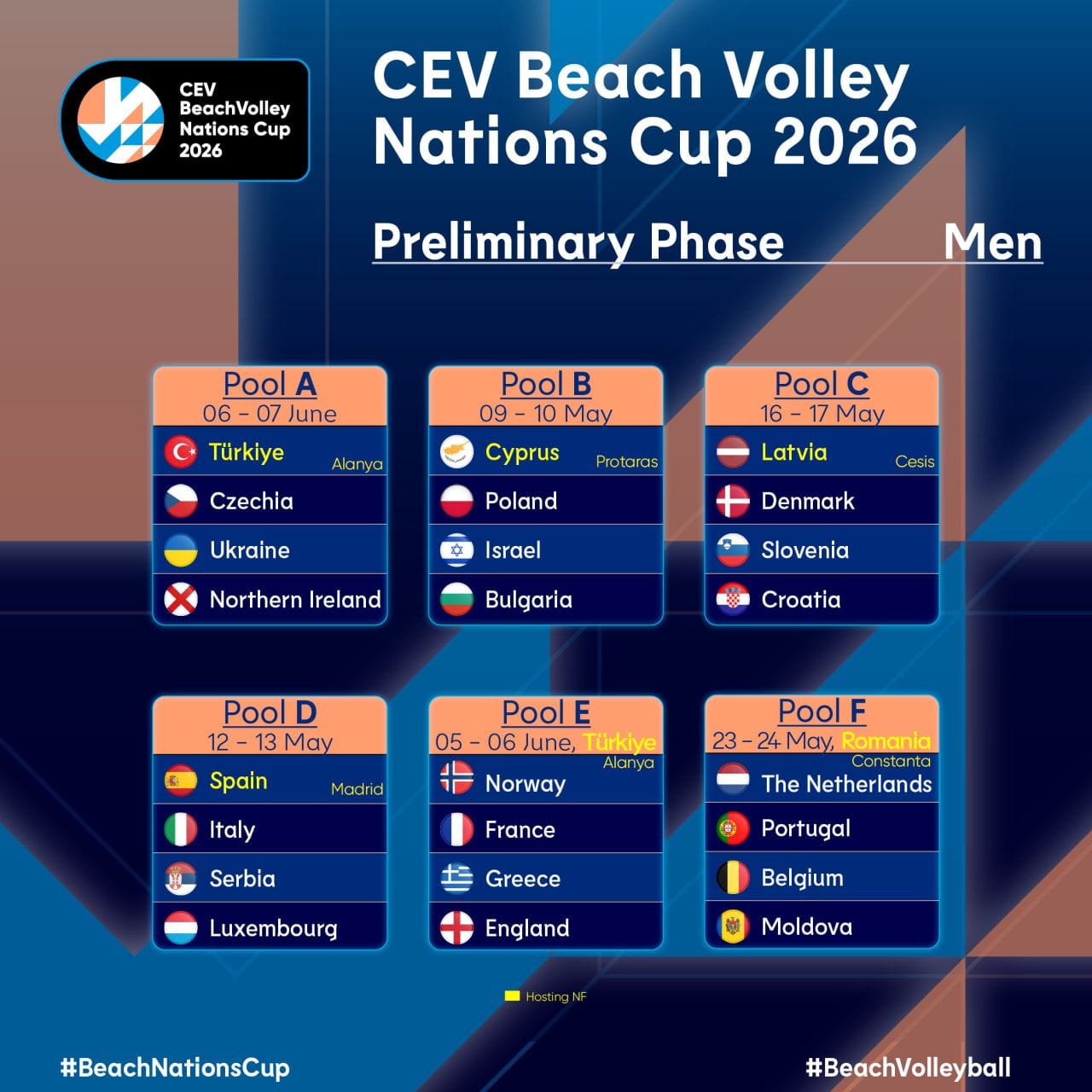 Erkek Plaj Voleybolu Milli Takımımız grup aşamasında Çekya, Ukrayna ve Kuzey İrlanda ile Kadın Plaj Voleybolu Milli Takımımız da Polonya, Norveç ve Yunanistan ile mücadele edecek.