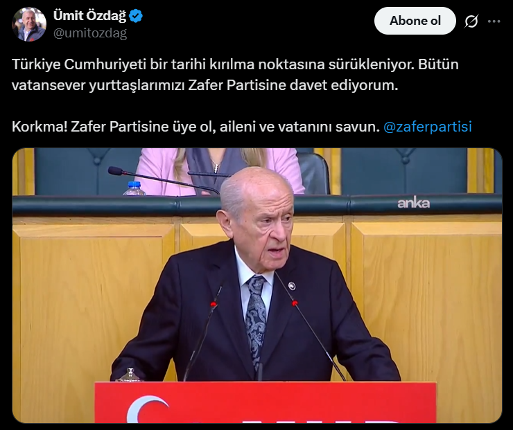 Herkesi Zafer Partisi'ne üye olmaya davet eden Özdağ, "Türkiye Cumhuriyeti bir tarihi kırılma noktasına sürükleniyor. Bütün vatansever yurttaşlarımızı Zafer Partisine davet ediyorum. Korkma! Zafer Partisine üye ol, aileni ve vatanını savun" ifadelerini kullandı.
