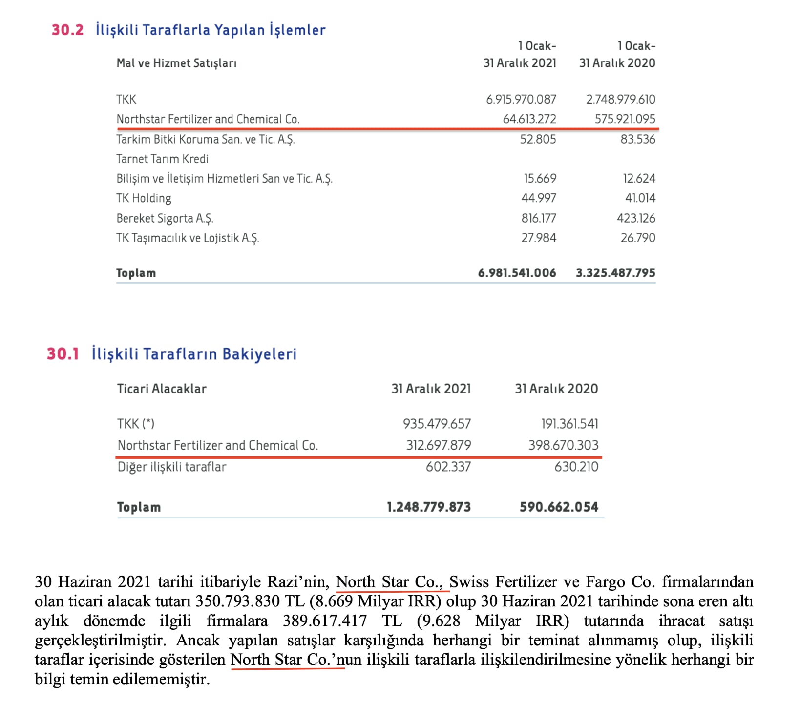 “30 Haziran 2021 tarihi itibariyle Razi’nin, North Star Co., Swiss Fertilizer ve Fargo Co. firmalarından olan ticari alacak tutarı 350 milyon 793 bin 830 TL olup, altı aylık dönemde ilgili firmalara 389 milyon 617 bin 417 TL tutarında ihracat satışı gerçekleştirilmiştir. Ancak yapılan satışlar karşılığında herhangi bir teminat alınmamış olup, ilişkili taraflar içerisinde gösterilen North Star Co.’nun ilişkili taraflarla ilişkilendirilmesine yönelik herhangi bir bilgi temin edilememiştir.”