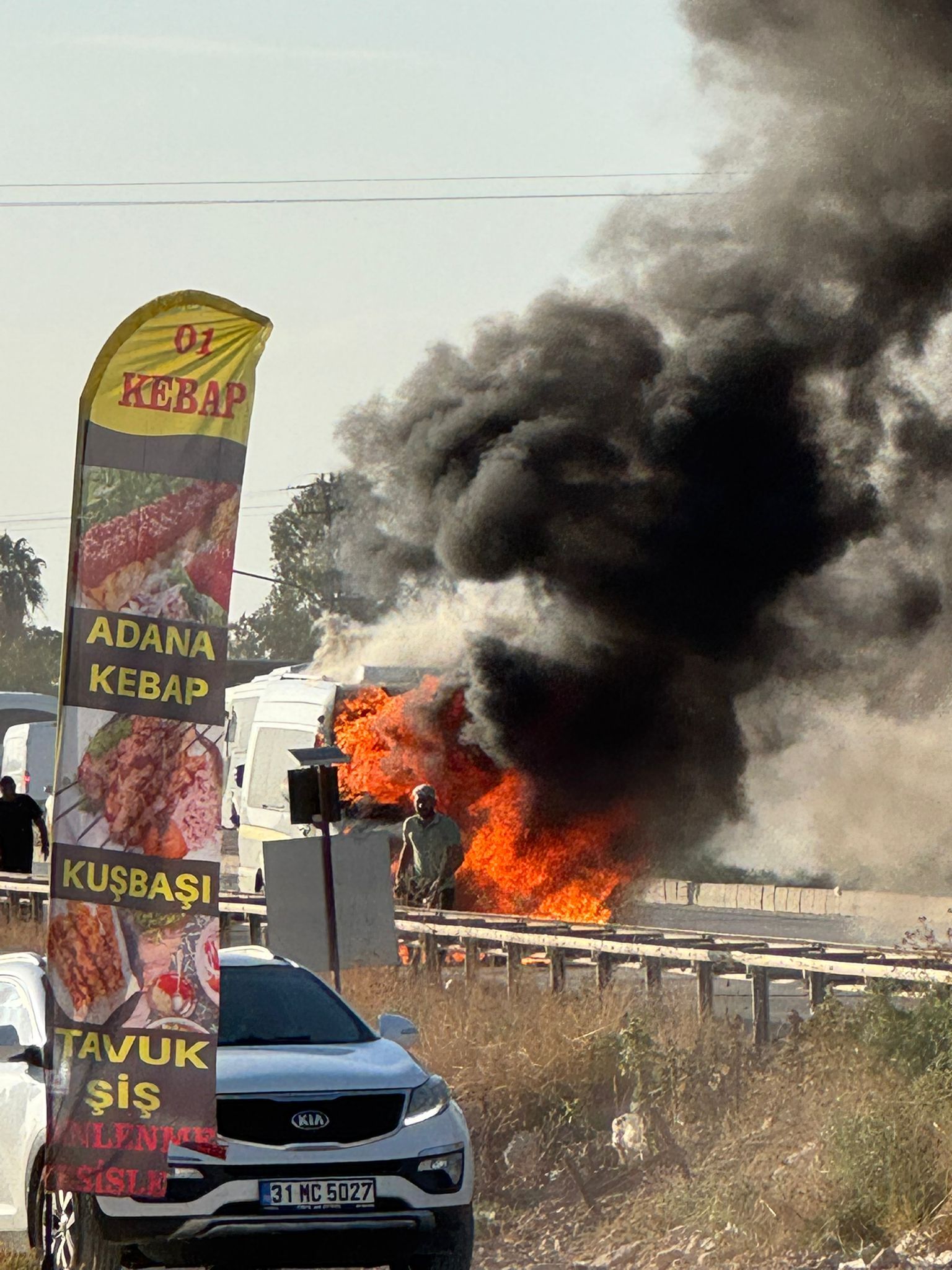 Adana'da işçi taşıyan minibüs ile çarpışarak savrulan motosiklet sürücüsü, kazada çıkan alevlerin arasında kalarak can verdi.