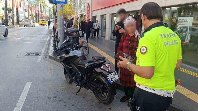Manavgat ilçesi Antalya Caddesi’nde devriye görevi ifa eden Manavgat İlçe Emniyet Müdürlüğü Trafik Denetleme Büro Amirliği ekipleri, seyir halindeki plakası okunamayacak şekilde bandana ile kapatılmış motosikleti durdurdu. Trafik ekiplerinin yaptığı kontrolde motosikleti kullanan Erdem C.’nin sürücü belgesinin olmadığı, kaskı yanında olmasına rağmen takmadığı ve aynaları kapattığı belirlendi. Motosiklet sürücüsü ve motosiklet sahibine toplam 43 bin 149 TL para cezası uygulandı.
