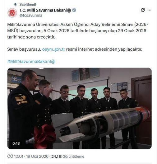 Bakanlığın sanal medya hesabından yapılan açıklamada, "Milli Savunma Üniversitesi Askerî Öğrenci Aday Belirleme Sınavı başvuruları, 5 Ocak 2026 tarihinde başlamış olup 29 Ocak 2026 tarihinde sona erecektir. Sınav başvurusu, https://www.osym.gov.tr resmi internet adresinden yapılacaktır" denildi.