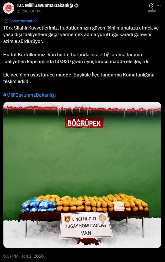 "Türk Silahlı Kuvvetlerimiz, hudutlarımızın güvenliğini muhafaza etmek ve yasa dışı faaliyetlere geçit vermemek adına yürüttüğü kararlı görevini azimle sürdürüyor. Hudut Kartallarımız, Van hudut hattında icra ettiği arama tarama faaliyetleri kapsamında 50 bin 930 gram uyuşturucu madde ele geçirdi. Ele geçirilen uyuşturucu madde, Başkale İlçe Jandarma Komutanlığına teslim edildi."